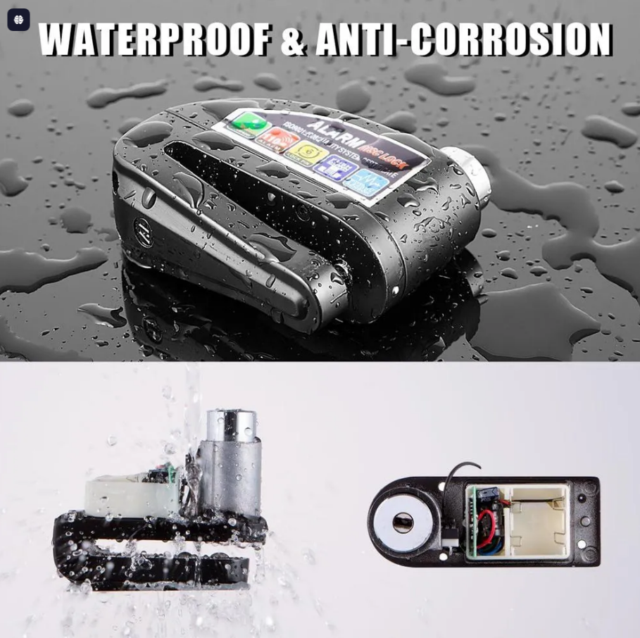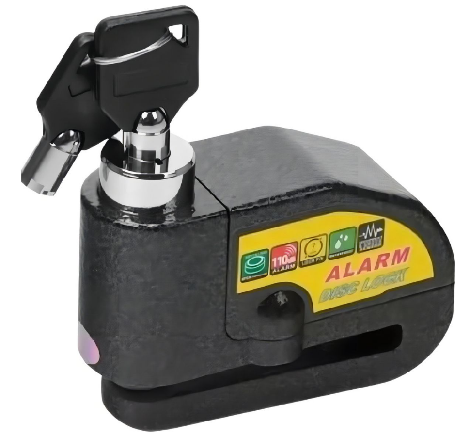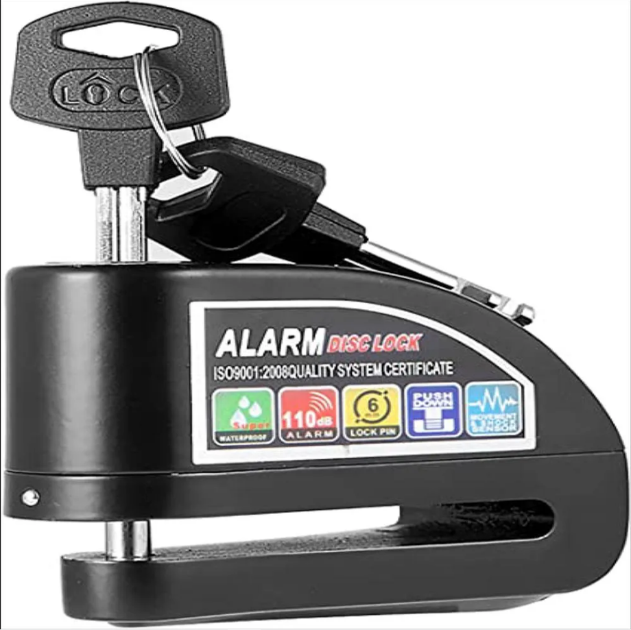 Candado para freno de disco de moto con alarma integrada de 110 dB, diseñado para aumentar la seguridad al estacionar en la calle. Fabricado en acero inoxidable, resistente e impermeable, incluye doble llave y un tamaño compacto que brinda protección efectiva contra intentos de robo.